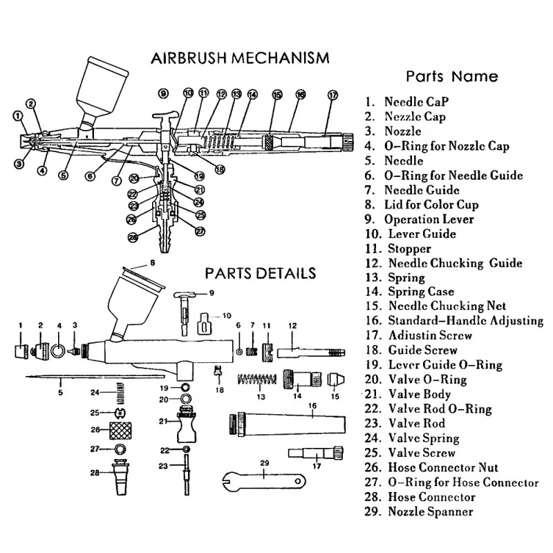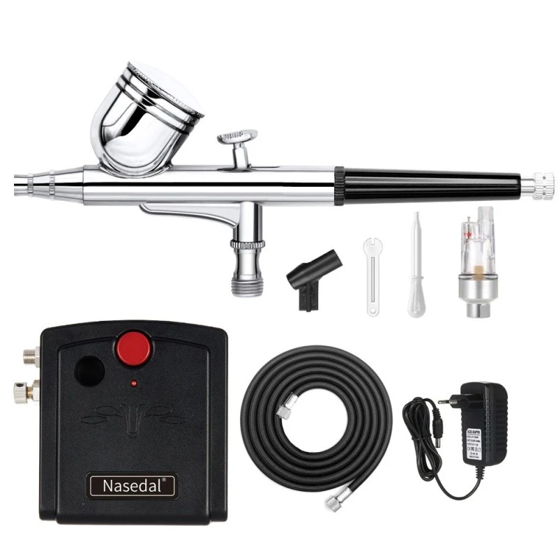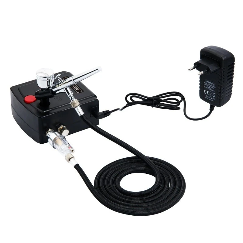 Comprend un compresseur d’air portable, un tuyau, un aérographe à alimentation par gravité à double action, un support, une clé à buse et un compte-gouttes.