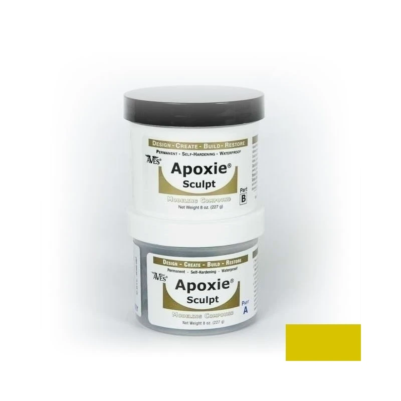 L’apoxie sculpt est une résine bicomposante de couleur qui sèche à l’air. Facile à prendre en main, elle se comporte comme du mastic. Une fois les deux parties mélangées, le temps de travail et de 2 à 3h. Le durcissement total est atteint au bout de 24h. Peut etre lissé au doigt ou avec un outil avant durcissement. Peut être poncé, percé, scié une fois durcis. Adhère à quasiment tout type de surface.