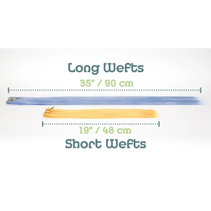 Want to add more thickness, volume, or length to your wig? Wefts are your answer! These wefts are nothing but an 8 foot (244 cm) long string of sewn fiber and weigh a considerable amount. Lots of fiber. Don’t eat them, though. It’s not that kind of fiber. The length of the hair is approximately 35″ (90 cm).