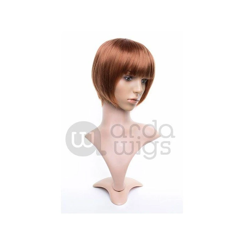 An extra-short feathered and layered bob with blunt cut bangs. Includes a 1″ (2.5 cm) skin top and makes a great base for our ponytail clips! Measures 7″ (18 cm) from crown to bangs and 10″ (30.5 cm) from crown to sides and crown to back. The sides in front have very small tails extending about 11″ (28 cm) from crown to ends.